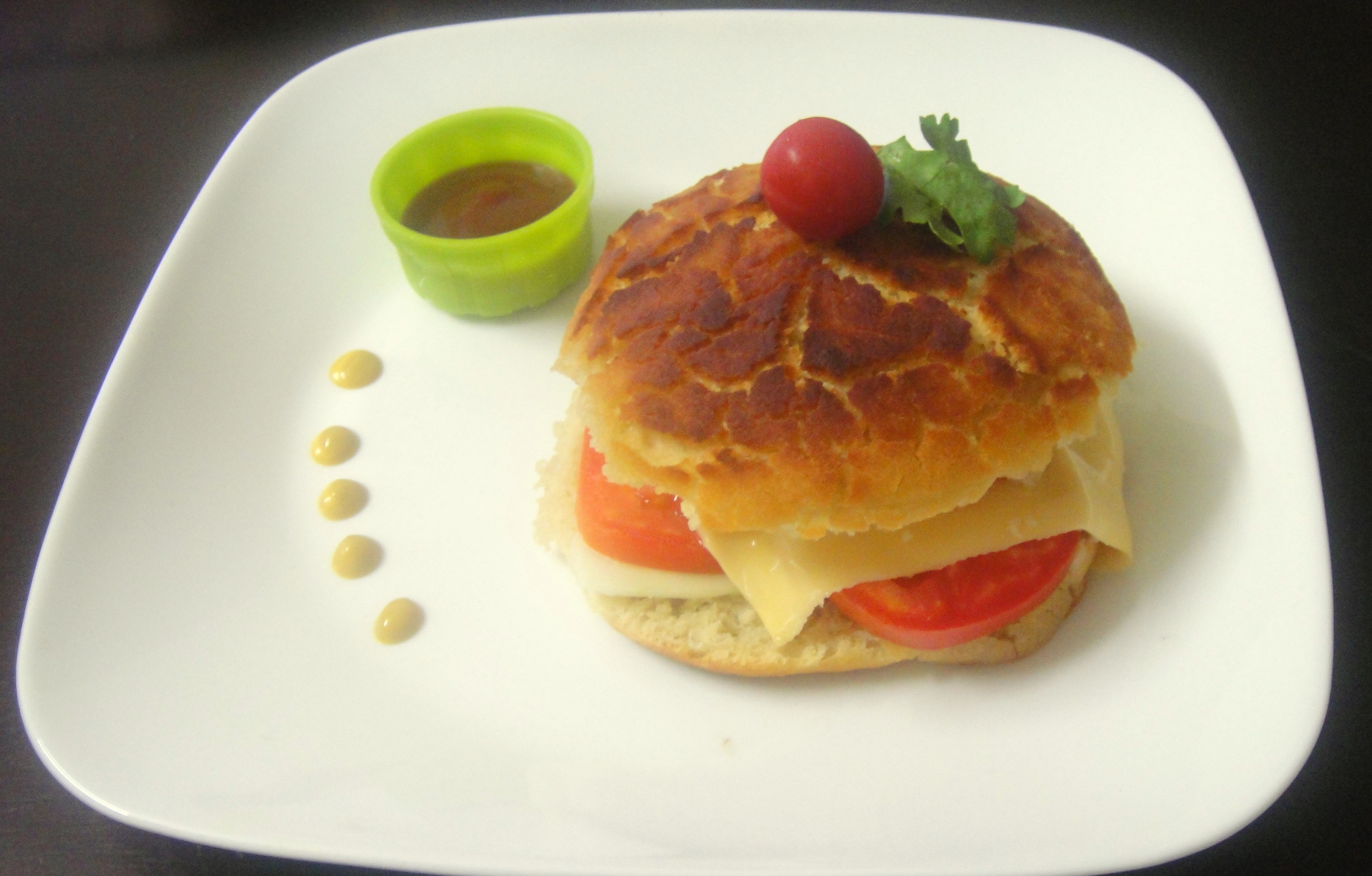 The second part of the challenge was to make a one of a kind sandwich with this bread. Since I was running short of time I made a sandwich with the simplest possible ingredients in my pantry. I cut one of the loaves in half and made a filling of cucumber and tomato slices, a cheddar cheese slice and some mustard and mayo to spruce up the taste. Nevertheless it tasted good and was very well enjoyed by my husband as a pre dinner snack.