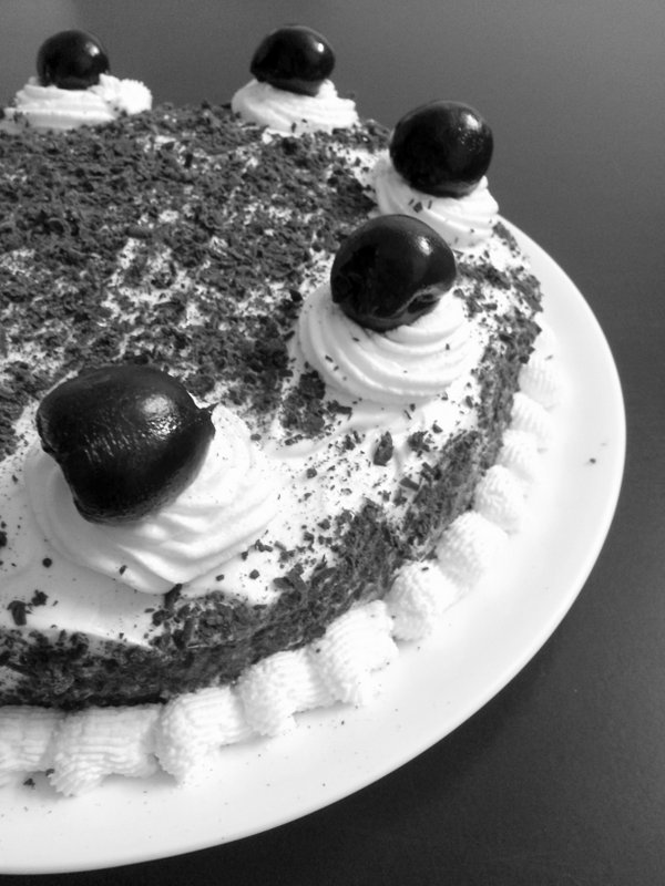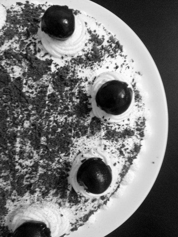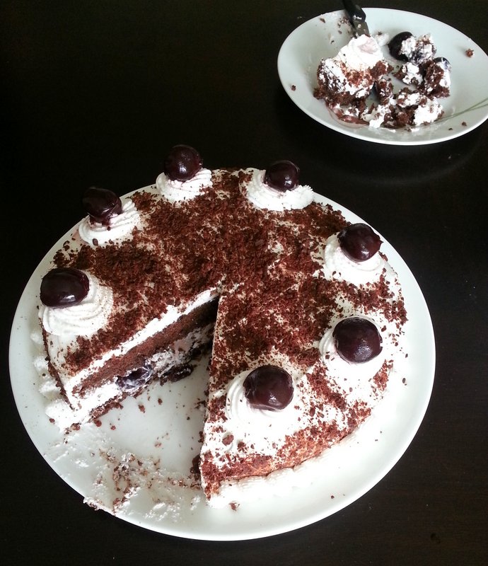 Using a sharp knife, cut the genoise, horizontally, into two layers. Alternately use the Lorraine Pascal method (as demonstrated on Masterchef Australia ) of using a thread (!) to split cake into layers. My sister did it a great job with it! Turn over the top layer of the cake (top of cake becomes bottom) and place on your serving plate. Brush the cake layer with 1/2 of the sugar syrup. Take 1 cup of whipped cream and spread on the moistened genoise. Place the cherries evenly over the cream. Brush the cut-side of second genoise layer with remaning syrup. Place cut-side down on top of the cherries, gently pressing to compact. Reserve one cup (240 ml) of whipped cream. First crumb coat the cake with the some cream. Place the cake in the fridge for about half an hour.Now spread the rest of the cream on the top and sides with a palette knife. Place reserved cream in a pastry bag fitted with a large star tip and pipe rosettes on top of cake. Cover and refrigerate the cake for several hours (or overnight) before serving. Decorate with cherries and shaved chocolate.