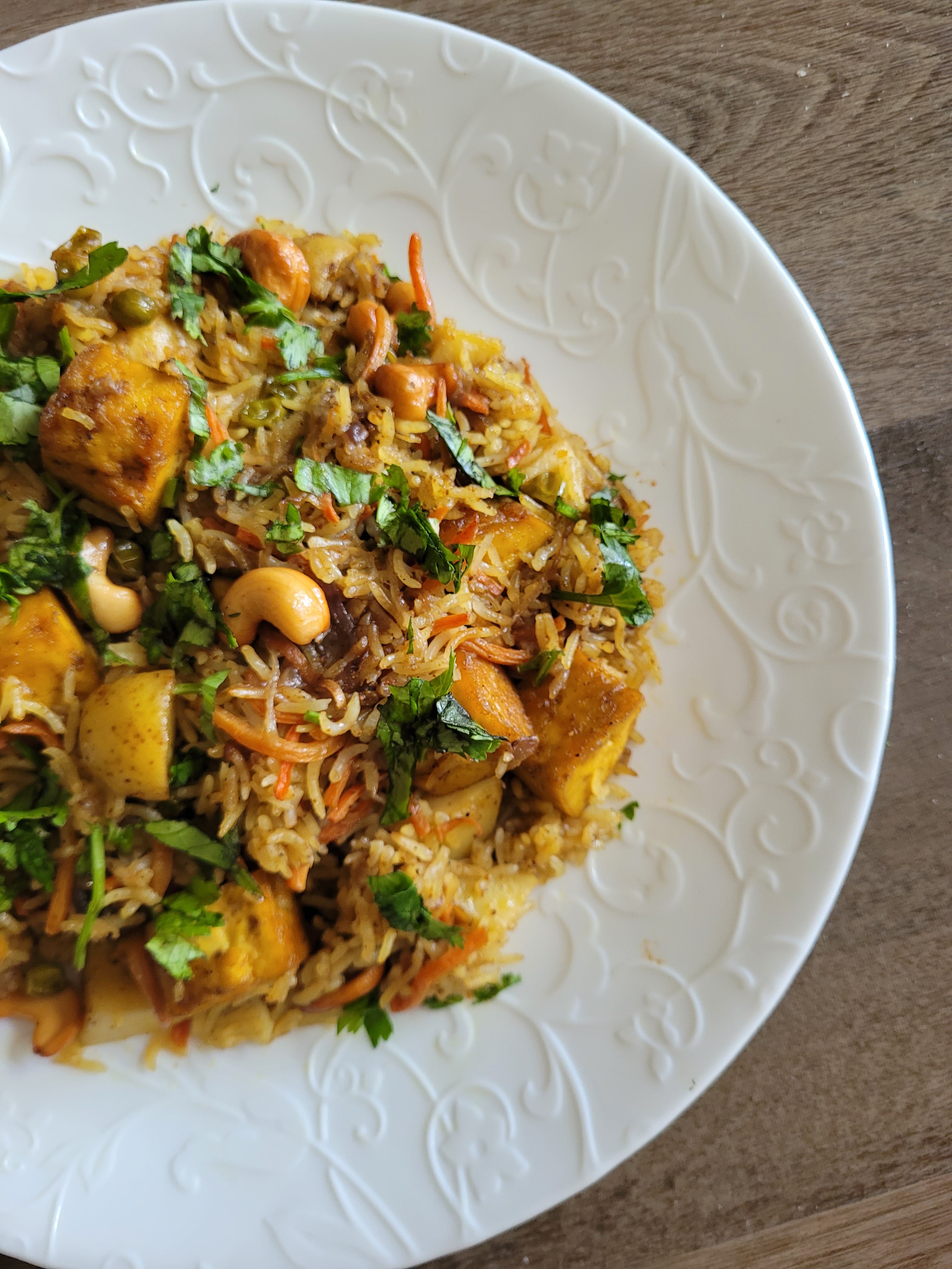 Recently I have been obsessed with converting all Indian dishes I cook on the stove to recipes I can easily cook in an Instant Pot. But making Biryani in the Instant pot was something I was reluctant to try because I always use an open pot method to cook the rice. In fact I cook all my rice using this method. This gives me the flexibility to test the rice grain by hand to see how ‘done’ it is. Because I am not aware of a technical term like ‘al dente’ for cooking rice to the desired “bite”, I will take the liberty to say that I cook my rice ‘al dente’ before mixing it with the other biryani components. However, this post is my 1st attempt at making Tofu Biryani in an Instant Pot and the outcome was quite good. The rice turned out fluffy i.e. not soggy – an outcome I was scared of the most. But as an afterthought its the amount of water that you add which matters the most.
