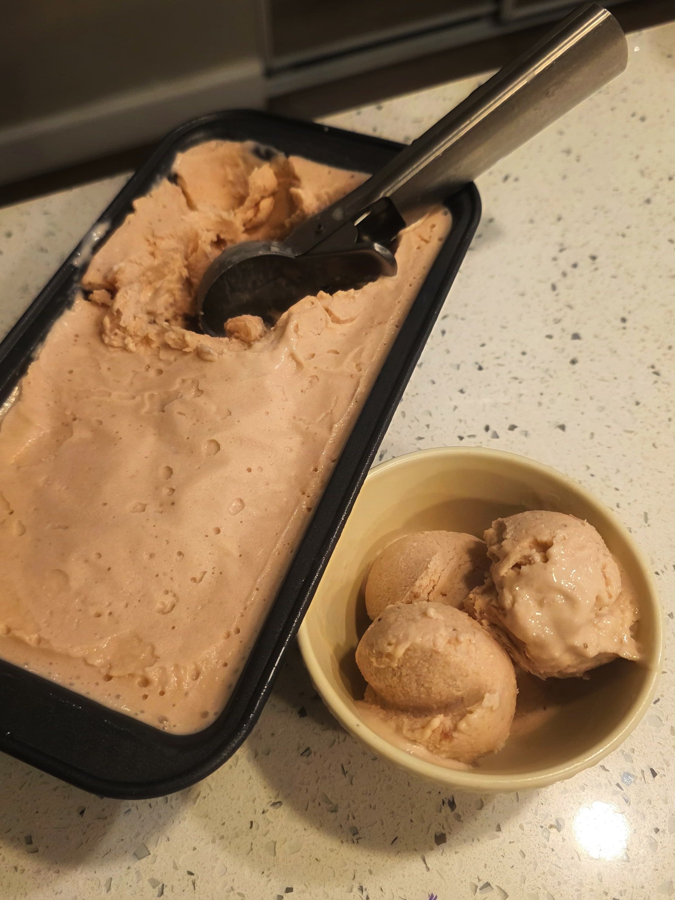I was initially going to let it freeze overnight, but then decided to test if it had solidified. I warmed up an ice cream scoop and dug in and Voila! it came out effortlessly. I dug in to get two more scoops into my bowl and resumed watching ‘Better Call Saul’. I had read on Reddit that there is a chronological order to watching Breaking Bad and that’s what I will be doing, although some people disagree as this order gives away spoilers. I’m quite excited for this mega-binge watch event which is going to take over several weekends to finish. Okay, I am digressing now. Back to the ice cream!